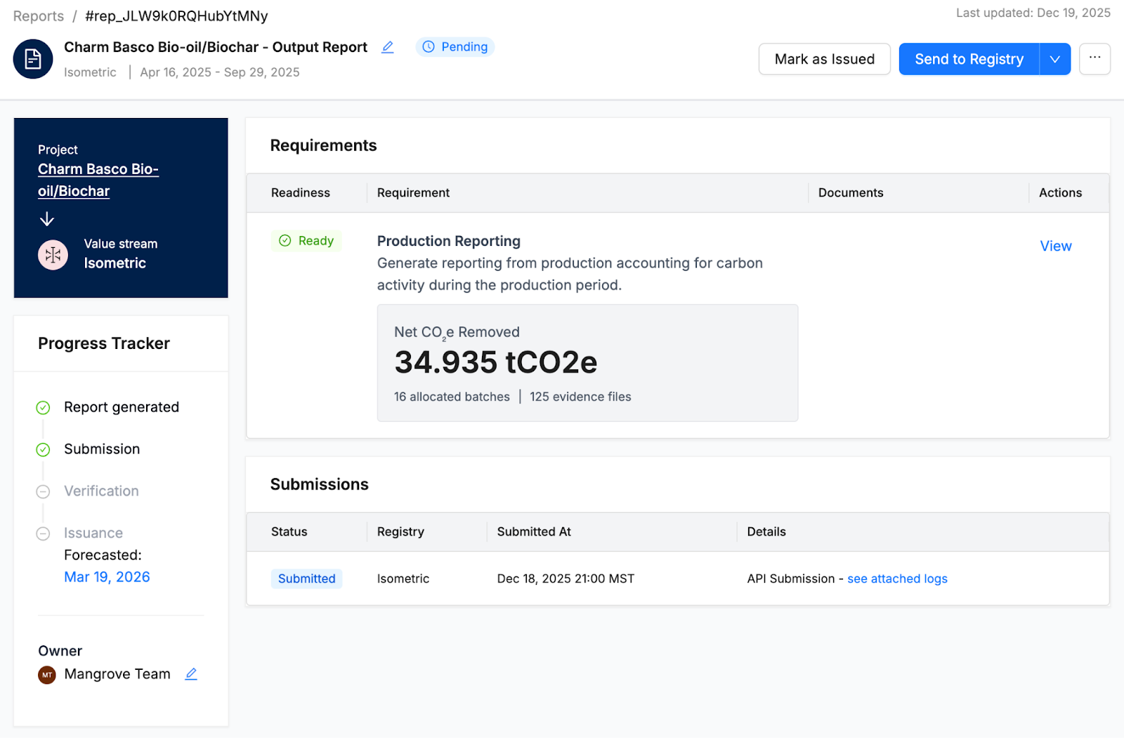 Mangrove successfully integrated with Charm's operations and registry reporting in Q4 2025 to create a frictionless process from production to credit issuance. The platform handles data acquisition and review, dual-stream quantification, automated evidence generation, and everything in between. While Ledger remains available for public data viewing, Mangrove's digital data infrastructure now powers the backend operations.